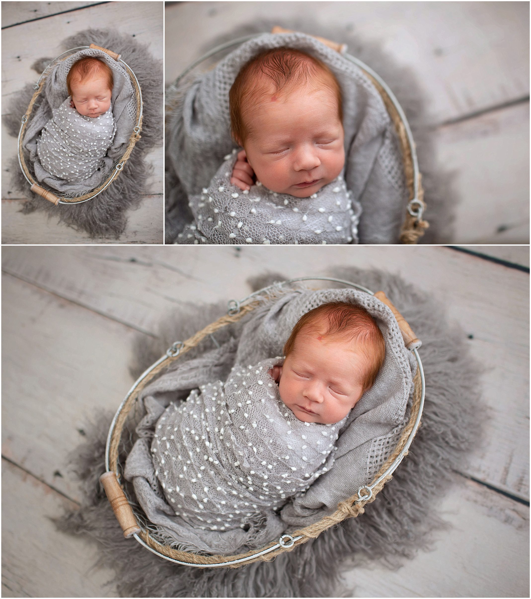 Bennett is a super cute red-headed baby, and was super easy to work with. We did this session as a Newborn Mini Session which takes about an hour in my studio and includes 2-3 wrapped poses like you see here and 5 images of your choice. Additional images are available for purchase for $12 each. I always try to have 3-4 different props set up in colors of your choice but always encourage clients to look at my large prop collection in the studio in case they see anything they like better. Having the full studio at your disposal is pretty handy!
