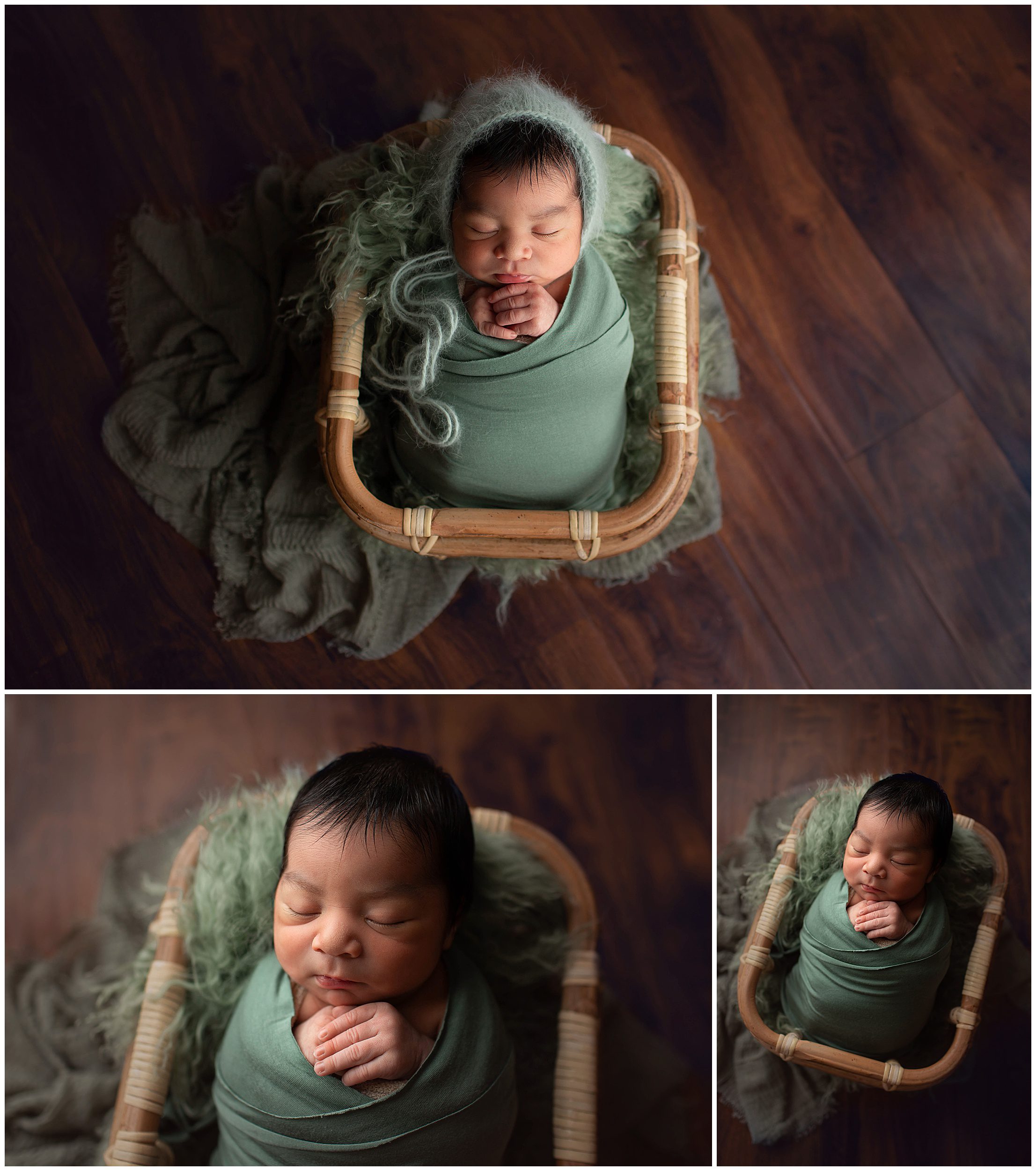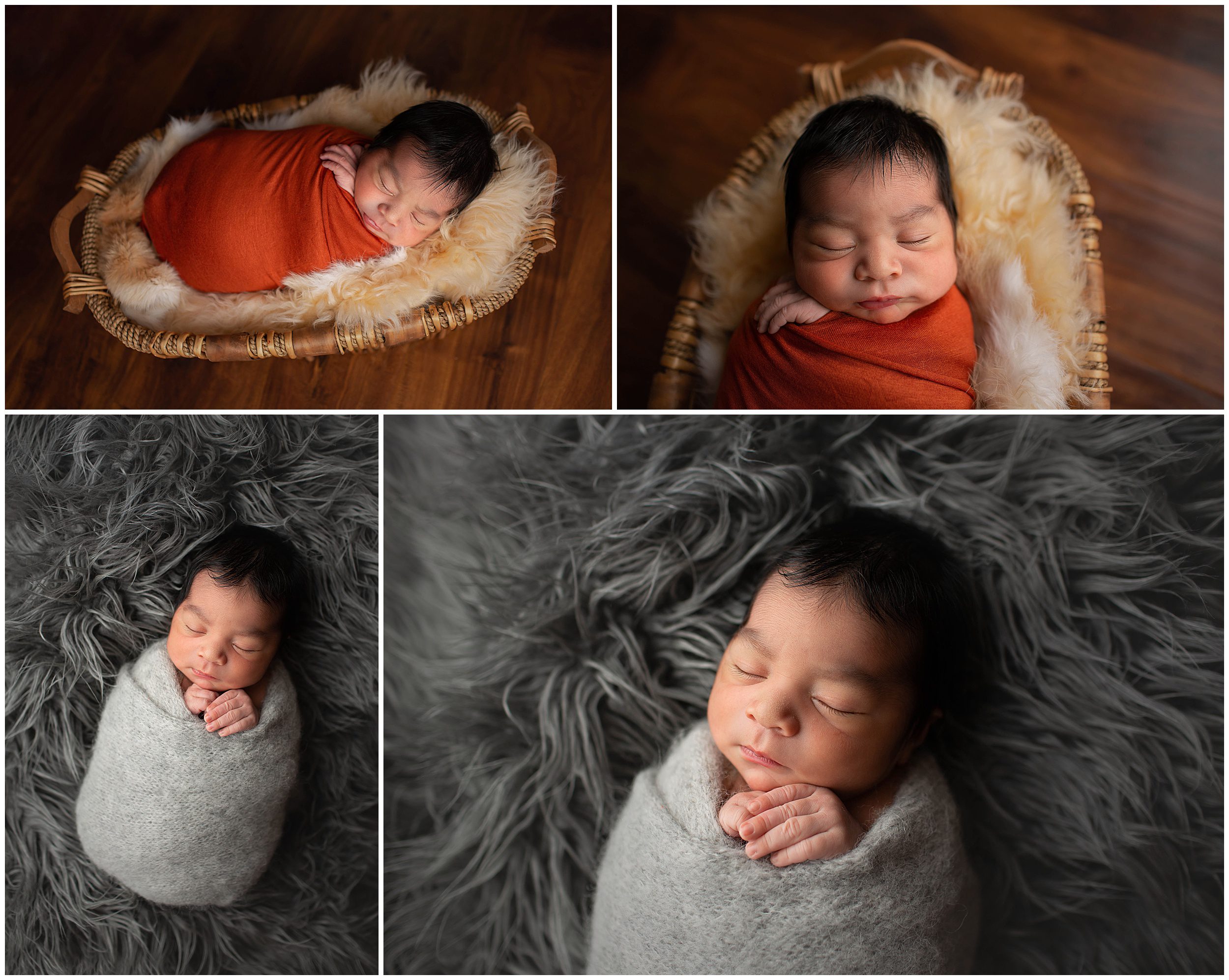 It felt so good to do a newborn session after a long hiatus due to the Covid pandemic! Little Ben was a perfect baby and super easy to photograph once he ate (and he ate a lOT!). We did the session in their home so that I can minimize the germs going in/out of my studio. After the session I brought everything home to wash/sanitize before I put it back in the studio. It’s a good thing I brought along my studio light because the natural light was a dark yellow thanks to the wildfire smoke. His mom didn’t have any preferences as far as colors or props go so I decided to bring some fall colors with rusty orange, green, and gray. I brought along several bonnets but wound up liking the photos without them the best since he has such a beautiful head of hair 🙂
